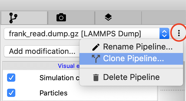 The Clone Pipeline function of OVITO lets you duplicate the currently selected data pipeline in order to visualize multiple datasets side by side or visualize the same dataset in several different ways. The function can be invoked by selecting from the pipeline menu depicted on the right.