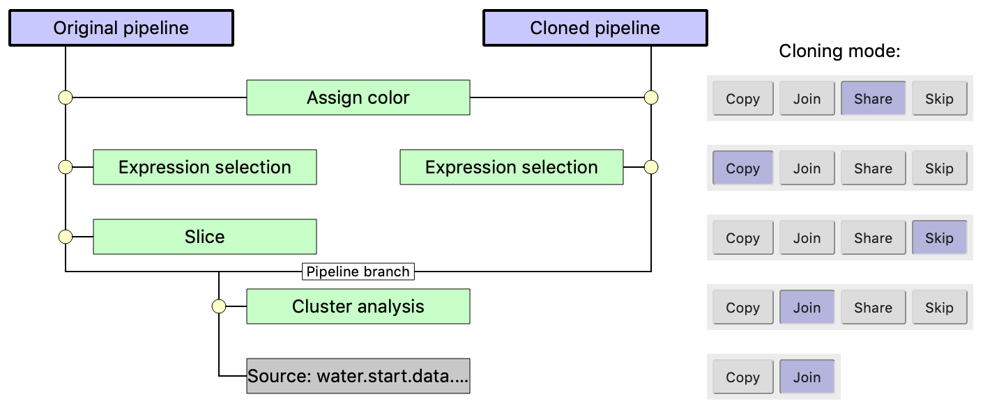For any data source or modifier of the existing pipeline, you can choose between four different cloning modes in the Clone Pipeline dialog: