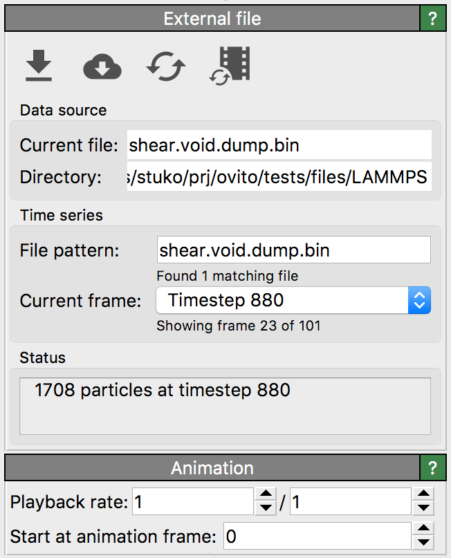 The "External file" panel lets you configure the parameters of the data source, in particular from which external file(s) the input data for the current data pipeline should be read. The panel is automatically displayed after you imported a data file via OVITO's or menu functions. You can return to the panel at any time by selecting the topmost entry under the "Data source" section of the pipeline editor.
