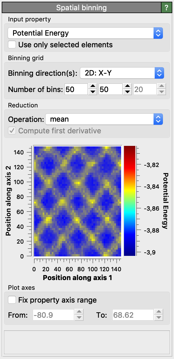 This modifier generates a 1-, 2- or 3-dimensional grid covering the simulation domain and assigns each particle into one of the uniformly sized bins. It then performs a reduction operation for a selected particle property, mapping the values of all particles contained in a cell to a single output value. This modifier can thus be used to project the per-particle data to a structured grid, for example to coarse-grain the atomistic data and generate a continuous field representation of a particle property. You can choose between different reduction operations, e.g. sum, average (mean), minimum or maximum.