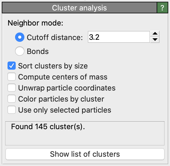 to report the number of particles in the largest cluster (only if the sort-by-size option is used). This information can be exported from OVITO in the same way as explained above. - Particle assignment to clusters