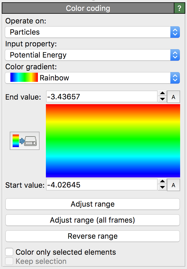This modifier assigns colors to particles, bonds, vector glyphs, voxels or surfaces according to a selected input property. It thus provides a simple way of visualizing local property values by means of a coloring scheme.