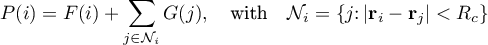 for computing the output property value P(i) for some particle i. The first term, F(i), refers to the standard part of the expression, which only depends on the properties of particle i itself. The second term consists of contributions from all nearby particles within a spherical region of radius Rc centered around particle i. These contributions are computed according to a second user-defined function, G(j), which is evaluated for every neighbor particle j. This formula for the user-defined function G(j) must be entered into the input field labeled Neighbor expression, and it can depend on property values of the current neighbor j, property values of the central particle i, the distance and the vector between the two particles, as well as global quantities.