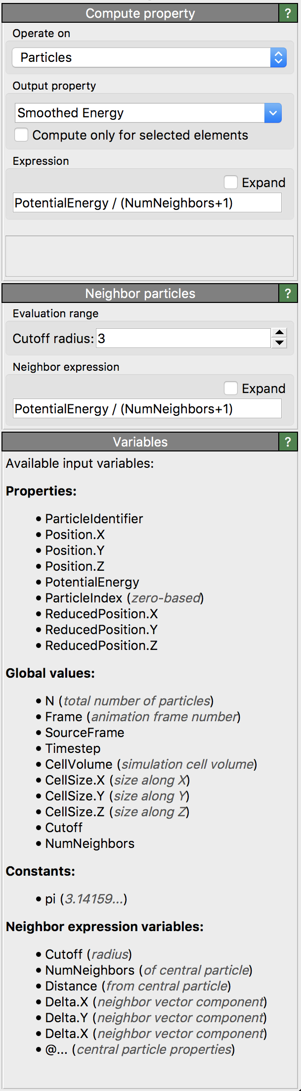 In the standard case, the expression for computing the output value for a particle depends only on the values of existing properties of the particle as well as global quantities such as the current simulation time. Optionally, the modifier allows you to specify a formula that includes terms referring to the properties of neighboring particles within a certain range around the central particle for which the output property value is being calculated.