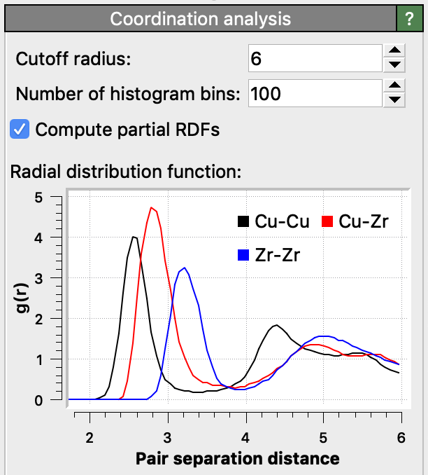 The modifier also computes the radial pair distribution function (radial PDF, or simply RDF) for the particle system. The radial pair distribution function g(r) measures the probability of finding a particle at distance r given that there is a particle at position r=0; it is essentially a histogram of pair-wise particle distances. The pair distribution function is normalized by the average number density of particles (i.e. the total number of particles in the simulation cell divided by its volume). See the Wikipedia for more information on this distribution function.