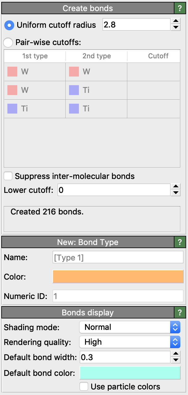 The modifier defines a new bond type, which will be assigned to bonds newly created by the modifier. The properties of this bond type, in particular its name and display color, can be edited in the second parameter panel. Furthermore, the modifier will automatically create a bonds visual element, which controls the visual appearance of bonds. The third parameter panel shows the display settings of this visual element.