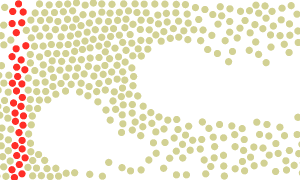 button starts the line tracing process. OVITO will read in all simulation frames one after another and sample the particle positions to produce the trajectory lines. The generated lines will be stored by the modifier in memory, and they will not be updated unless you press the button again.The following animation shows a system of Lennard-Jones particles flowing around two obstacles. The paths of motion of the red marker particles have been visualized using trajectory lines, which were generated by this modifier. The Show up to current time only option of the Trajectory lines visual element restricts the rendering of the trajectory lines to a dynamic time interval that ends at the current animation time. Thus, the lines appear to be traced by the moving particles.