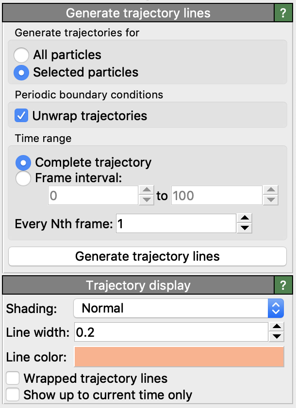 You can choose between generating trajectory lines for all particles in the system or just a subset of the particles. In the latter case, you need to select the particles first for which you would like to visualize the trajectories. Keep in mind that generating and visualizing trajectory lines for datasets with a large number of particles and/or a large number of timesteps can be prohibitively expensive. Thus, it typically is a good idea to restrict the generation of trajectory lines to just a small group of particles which are of interest.