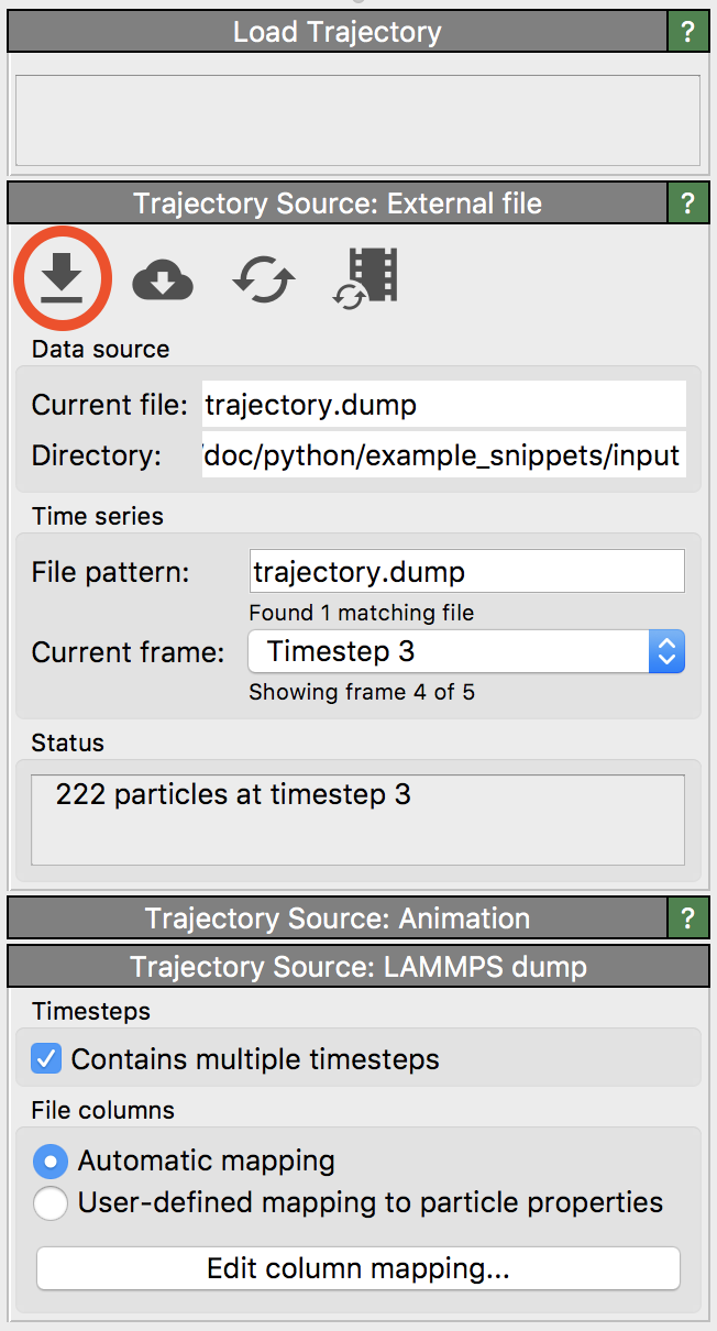 To load such a pair of topology/trajectory files in OVITO, first open the static topology file using the normal Load Trajectory modifier and use the load button (highlighted in the screenshot) to select the corresponding trajectory file. After loading the trajectory file, the modifier will subsequently replace the initial particle positions with the time-dependent positions read from the trajectory file. The same is done for the simulation cell geometry and also the values of any other particle property stored in the trajectory file.