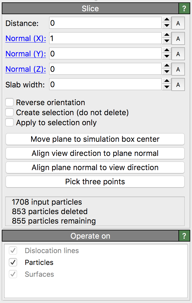 This modifier either deletes or selects all elements on one side of an infinite cutting plane. Alternatively, the modifier can cut out a slab of a given thickness from the structure (see pictures).