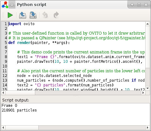 The user-defined script has full access to OVITO's data model and can access viewport properties, camera and animation settings, modifiers, and data pipeline outputs. For more information on OVITO's Python interface and the object model, see the scripting reference.