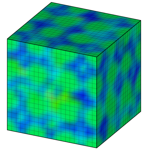 This visual element renders the voxel grid as a solid object showing just the voxel cells on the outer boundaries of the domain. Note that by default the voxel cells will all appear gray, because they do not have a color assigned to them yet. You can use the Color coding modifier to given them a color and visualize a numeric field quantity associated with the grid cells as in this example.