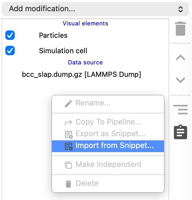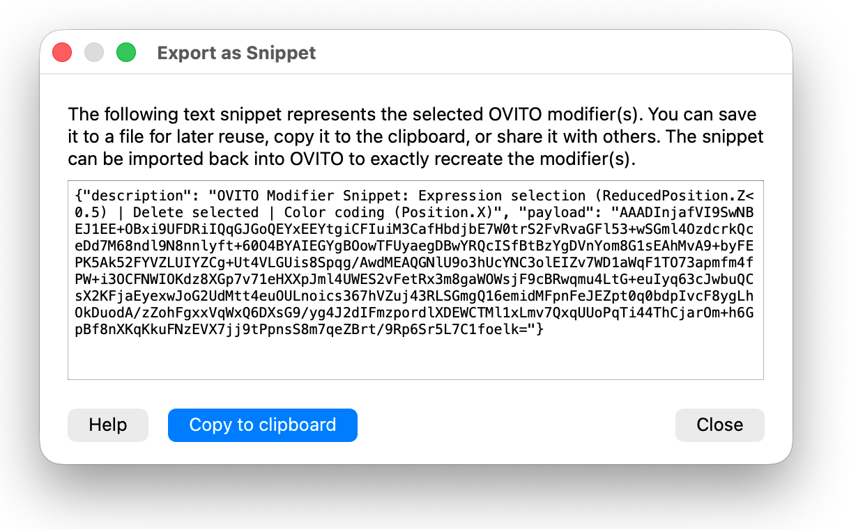 Modifier snippets provide an easy way to share modifier configurations with other OVITO users, for example in the OVITO online forum or with co-workers. A snippet is a portable text representation of one or more modifiers, including all their parameter settings, that can be copied to the clipboard, pasted into an online chat, email, or text file, and then imported into another OVITO session to exactly recreate the original modifier(s).