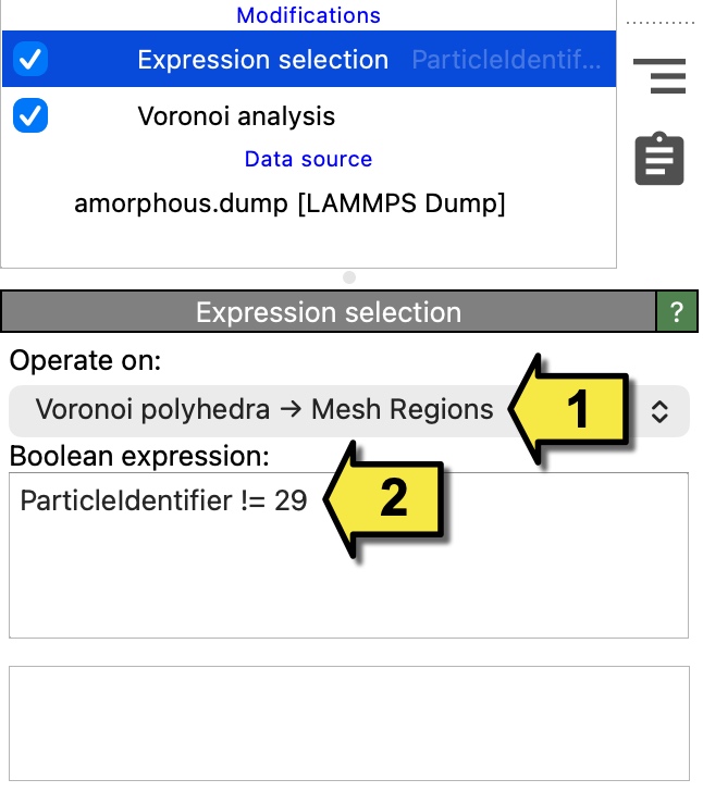 1. In the Operate on drop-down box, select Voronoi polyhedra –> Mesh Regions as the data element type to operate on. This tells the modifier to evaluate its expression for each Voronoi cell (mesh region) rather than for each particle.