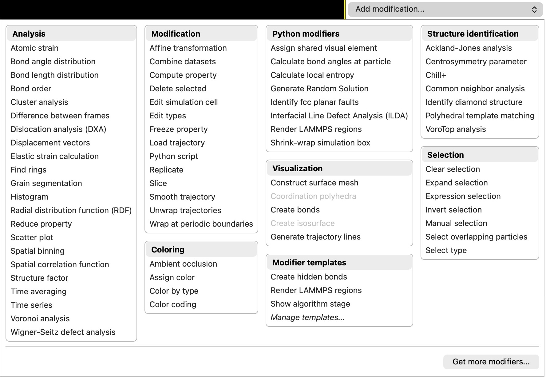 OVITO 3.15 is a major release that brings powerful new modifiers for molecular modeling, a streamlined workflow for sharing and organizing modifiers, and broad improvements to file I/O, video rendering, and platform support.