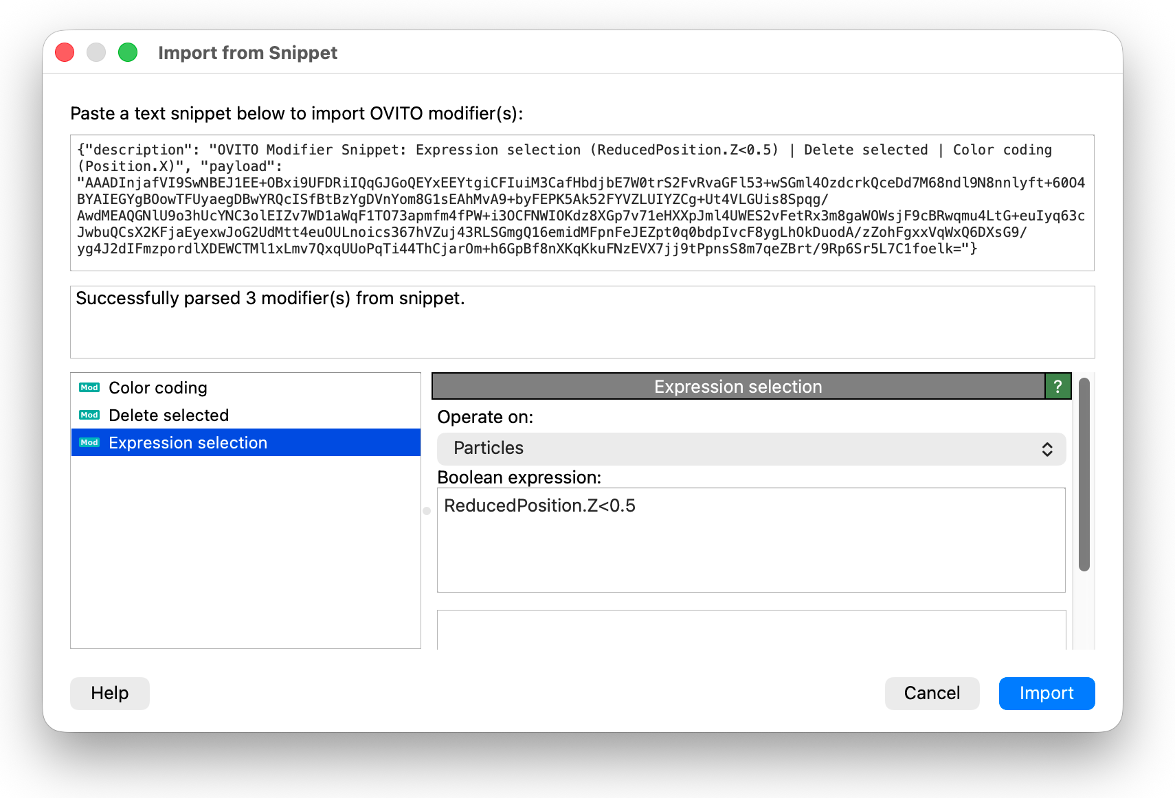 Modifier snippets provide an easy way to share modifier configurations with other OVITO users, for example in the OVITO online forum or with co-workers. A snippet is a portable text representation of one or more modifiers, including all their parameter settings, that can be copied to the clipboard, pasted into an online chat, email, or text file, and then imported into another OVITO session to exactly recreate the original modifier(s).