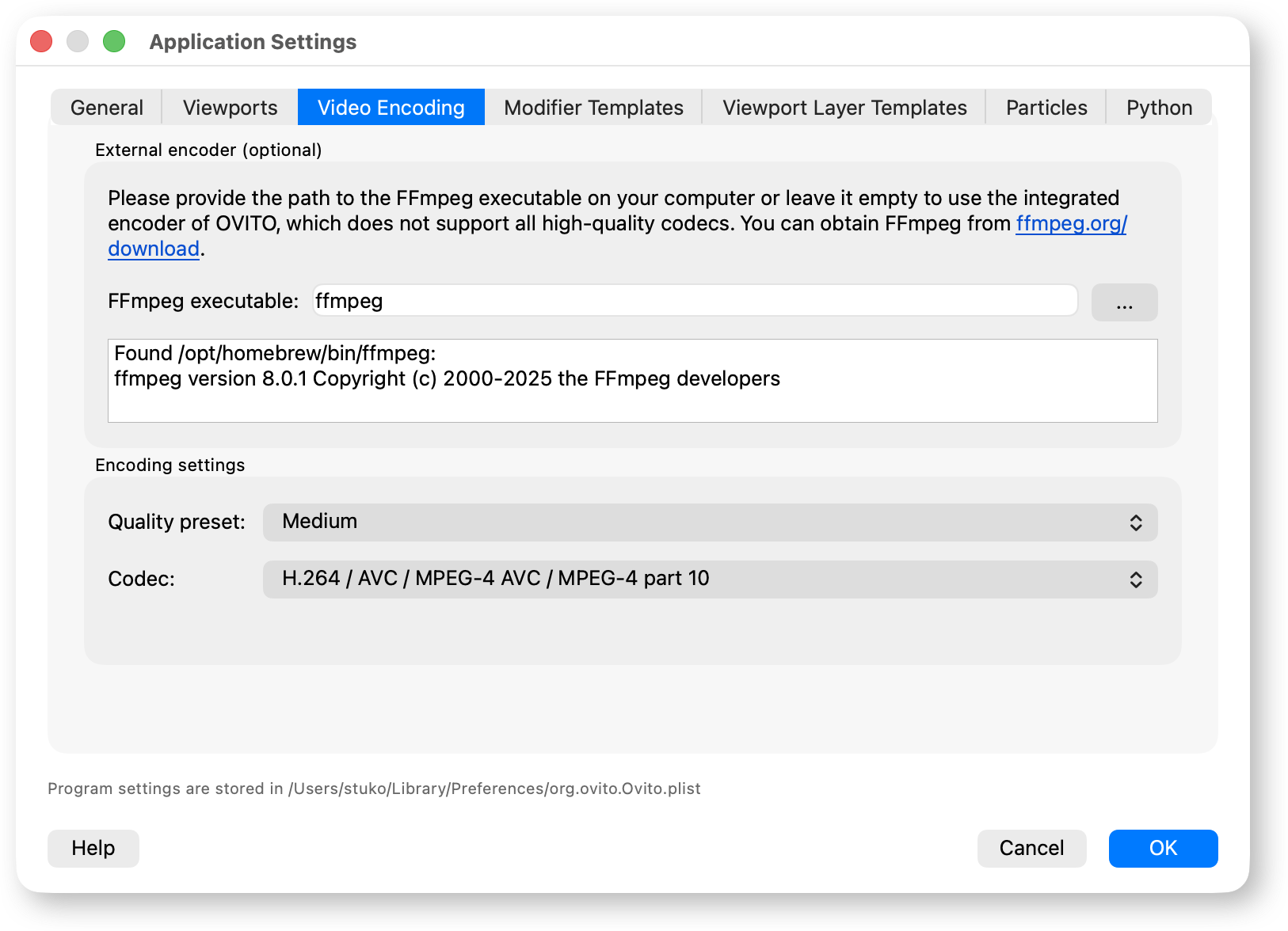 On this tab of the application settings dialog you can configure an external FFmpeg executable used for video encoding. This is optional — OVITO comes packaged with an integrated FFmpeg-based video encoding engine that will automatically be used for video encoding if no external FFmpeg executable is configured.