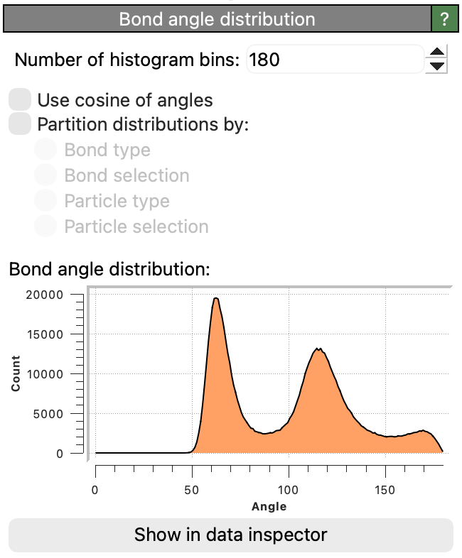 The computed histogram counts, in equisized bins, the angles formed by pairs of bonds meeting at the same particle. Bond angles \(\theta\) may range from 0 to 180 degrees. The modifier option Use cosines of angles switches the x-axis of the histogram to the range [-1, +1], now computing the distribution of \(\cos{\theta}\) values in the system.