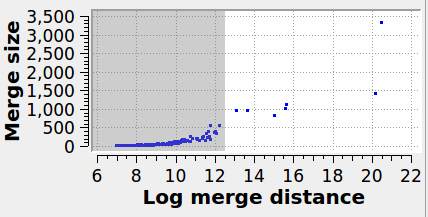 Specifies the maximum graph edge contraction distance and determines the resulting number and sizes of grains. A lower threshold produces more (and smaller) grains; a larger threshold produces fewer (and larger) grains. The scatter plot (“Log merge distance” vs “Merge size”) can be used to select an appropriate merge threshold value. If the grains are well-separated, the scatter plot will contain a dense cluster at low distances, and a few isolated points at higher distances. An ideal threshold lies after the dense cluster, but before the isolated points (see screenshot). Note that this threshold parameter can be set to a negative value, because it is specified on a logarithmic distance scale.