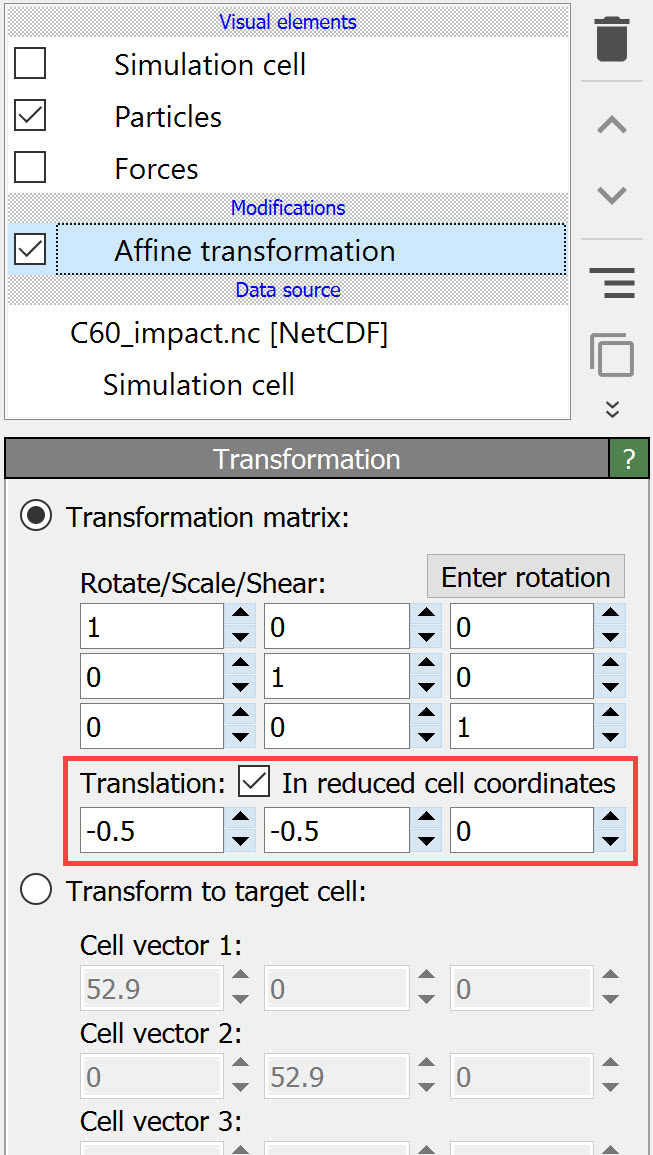 Open the Add modification… drop-down list and select Affine transformation from the Modification section. The newly inserted modifier appears as a new item in the pipeline editor. Activate the option In reduced cell coordinates as shown in the screenshot and enter the values \((-0.5, -0.5, 0)\) into the fields for the translation vector. This shifts the simulation box, including all atoms, such that the pivot point \((0,0,0)\) is now located in the center.