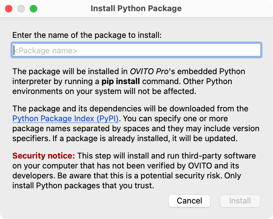 The function Install additional package makes it easy to install additional Python packages from the PyPI repository or the conda-forge channel, making them available within OVITO Pro. This function will run pip install or conda install commands in the background to download and install the selected third-party package(s).