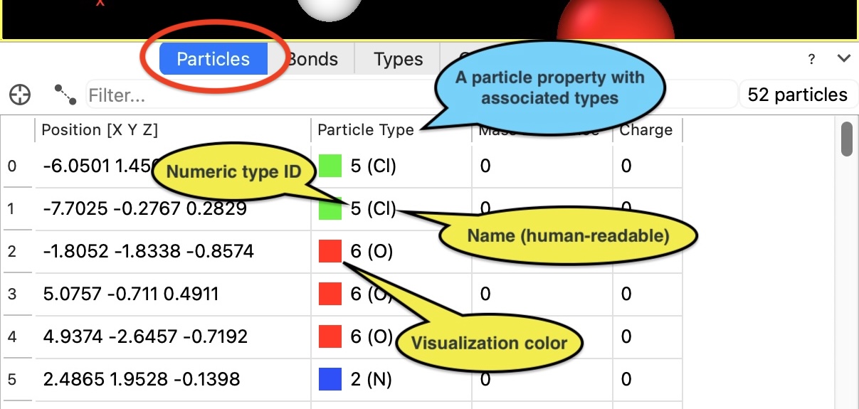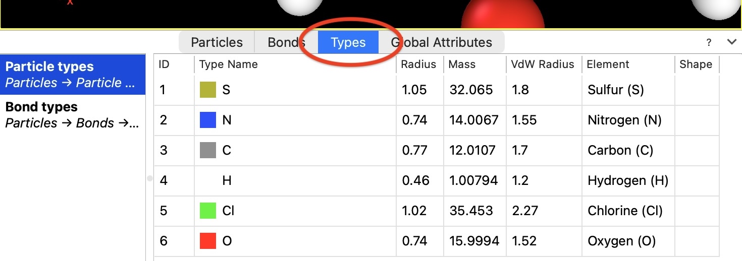The list of particle types loaded from a simulation file can be inspected on the Types tab. You can change the attributes of individual types by inserting the Edit types modifier into the data pipeline.