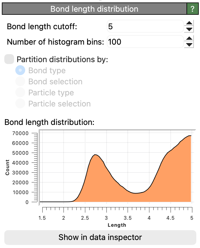 The modifier outputs the bond length histogram as a data table, which can be opened in the pipeline data inspector using the button Show in data inspector.