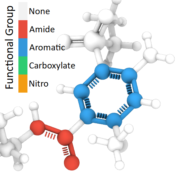 The modifier also identifies functional groups “Amide”, “Nitro”, and “Carboxylate”. This information is output as “Functional Group” properties of Bonds and Particles. Numeric type IDs represent the different functional groups: