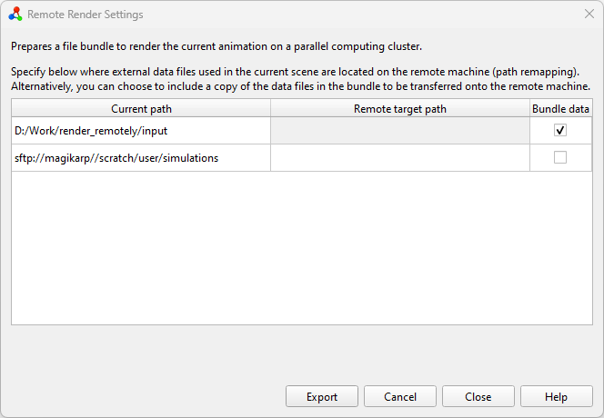 have been loaded from a remote server, other paths point to the local filesystem. For each current path, you can either enter a new remote target path or check the bundle data option.Remapping paths from a current to a remote target path is useful when the data files referenced in the current OVITO scene are already present on the remote machine where rendering is going to take place. For example, if the imported simulation trajectory was loaded locally from