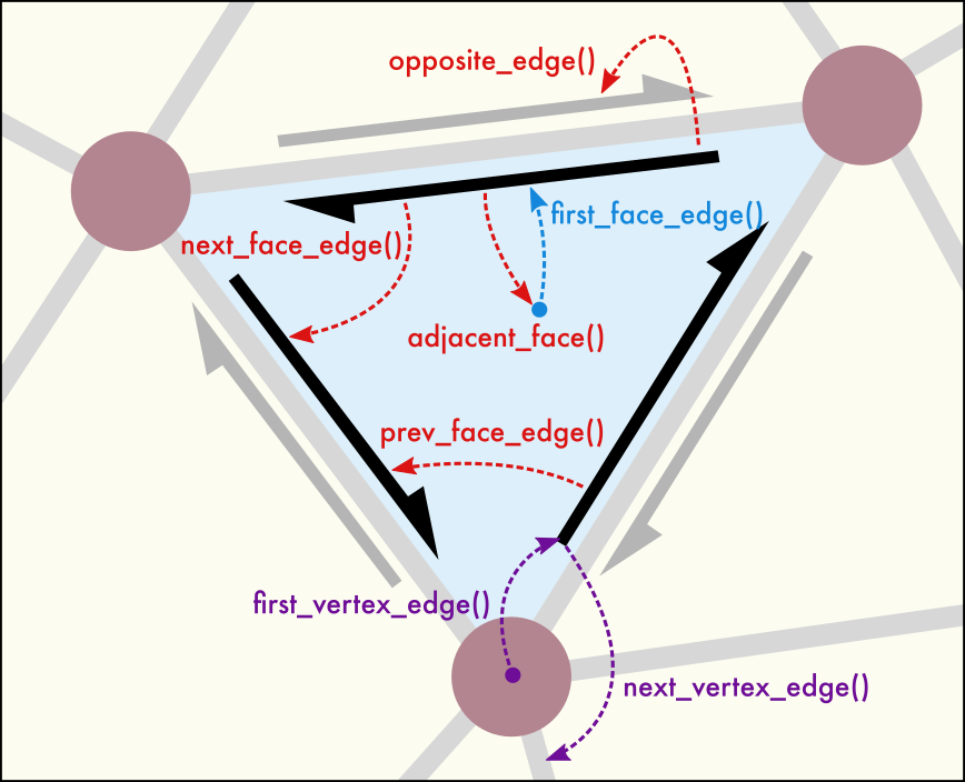 first_vertex_edge()this method allows you to iterate over all halfedges connected to some vertex. When the end of the vertex’ edge list has been reached, the method returns -1.The following example demonstrates how to visit all outgoing halfedges of some vertex and count them:
