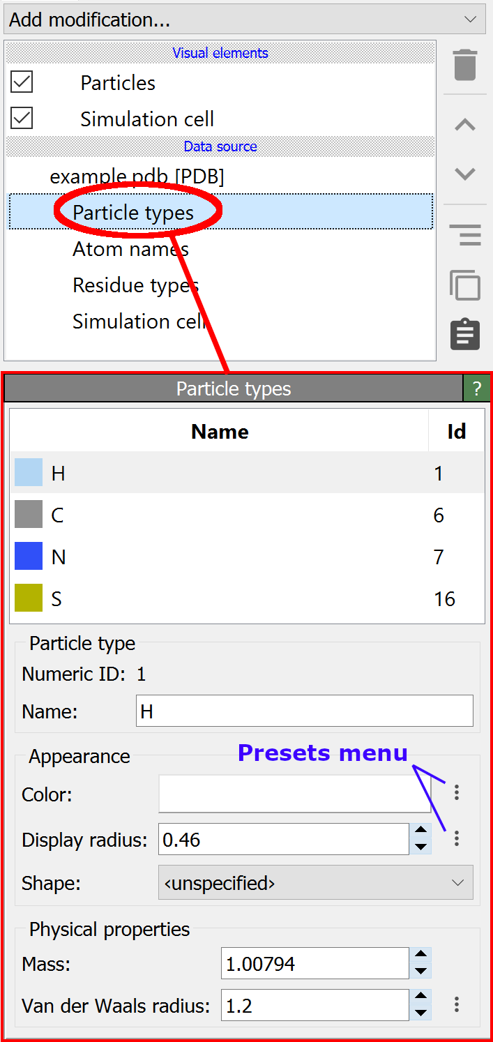 If a particle type’s name corresponds to a standard chemical element, OVITO automatically assigns default values for display color, display radius, van der Waals radius, and mass – based on an internal database of presets. You can change these defaults using the presets menu (see screenshot) or the application settings dialog.