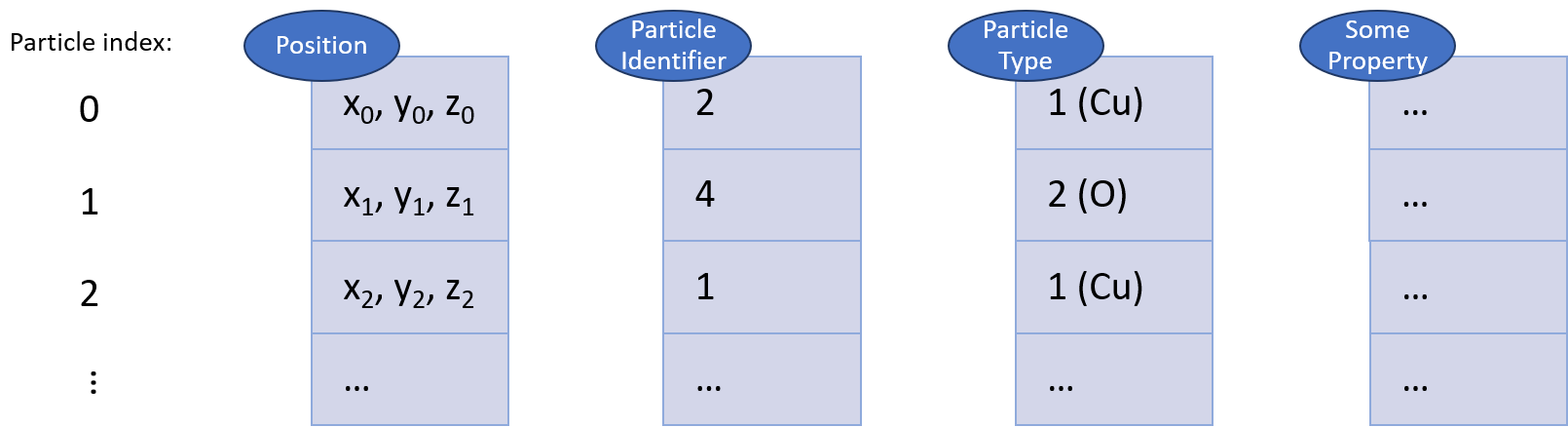 In OVITO, a system of N particles is represented as a collection of particle properties, each stored as a uniform data array of length N:
