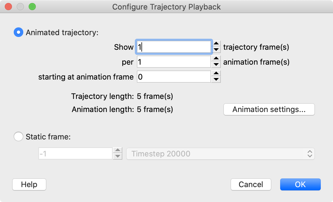 The Extract a static frame option allows you to isolate a single frame from the trajectory, which is useful for rendering camera animations with a static model (see tutorial Turntable animation of a model).