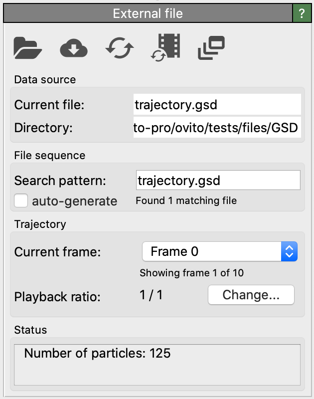 The External File panel allows you to configure the data source for the current pipeline, specifying which external file(s) should be used as input. This panel appears automatically after you import a data file using OVITO’s or functions.