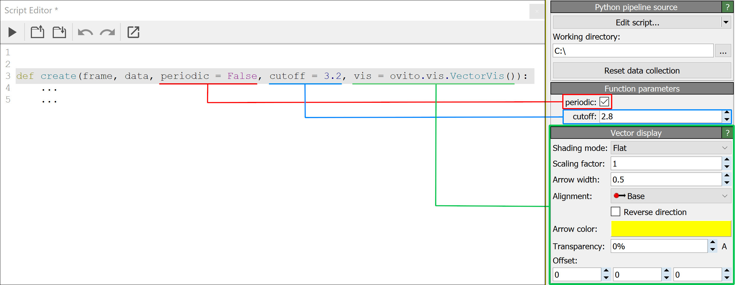Your create() function may define additional keyword parameters (all require initial default values), which will be treated as user-defined parameters managed by the data source. The user-defined parameters automatically appear in the graphical user interface of OVITO, and their values (which will be passed to create() by the system) can be adjusted interactively by the user. For example: