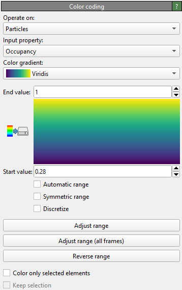 The function Adjust range resets the Start value and End value parameters to the current minimum and maximum of the selected input property, respectively. This ensures that no clamping of input values occurs for the current simulation frame. The function Adjust range (all frames) does the same but takes into account the entire simulation trajectory to determine the range of input property values. The function Reverse range simply swaps the Start value and End value parameters to effectively reverse the color scale.