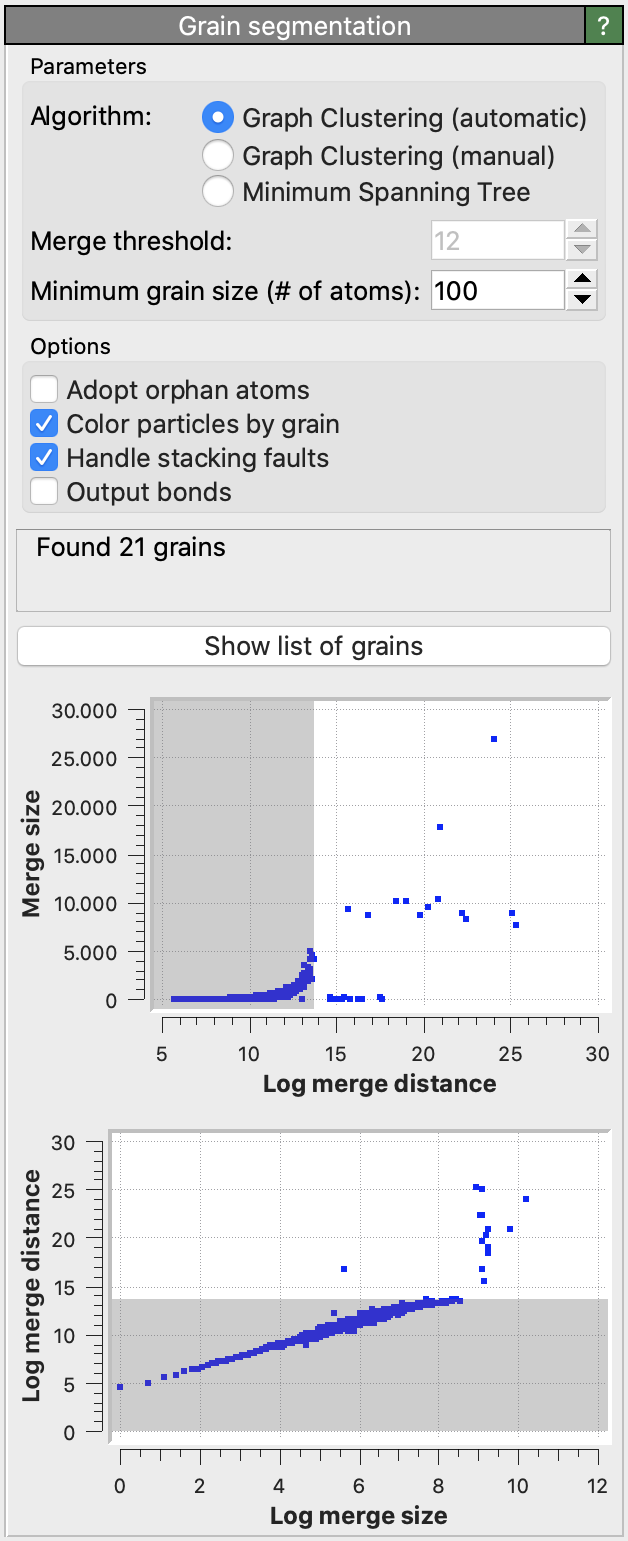 The automatic mode alleviates this problem by choosing a good merge threshold automatically for you using a statistical analysis of the sequence of graph merging steps, stopping the merging of crystallite clusters as soon as a deviation from the regular exponential behavior is observed.
