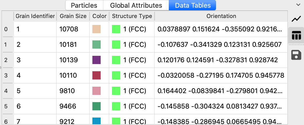 The list of grains is ordered by size, starting with the largest grain (in terms of the number of atoms).