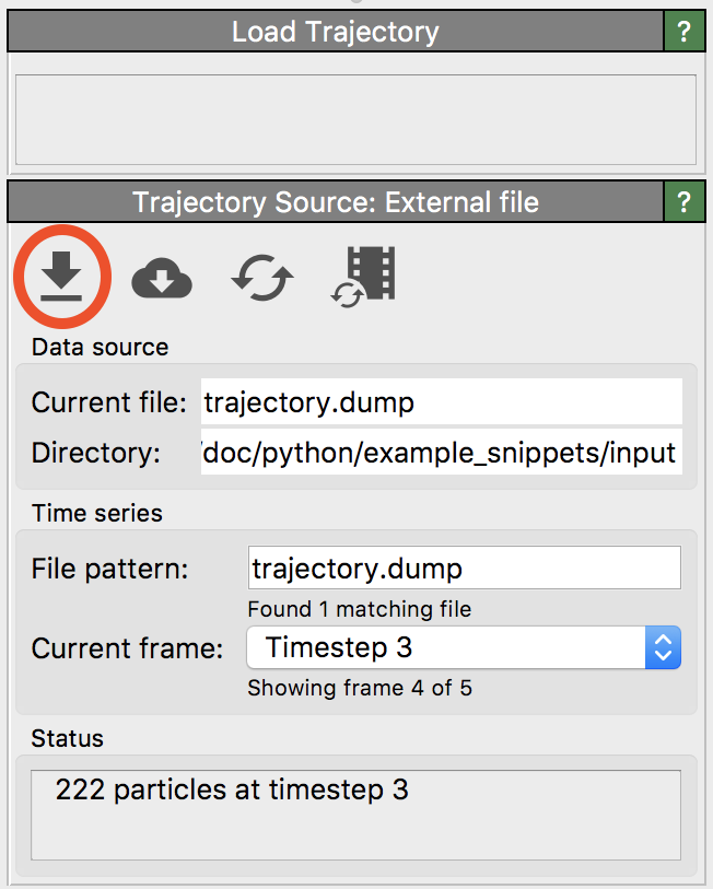 menu function. Then insert the Load trajectory modifier into the data pipeline and use the button highlighted in this screenshot to also load the corresponding trajectory file. Make sure you perform the last step in the user interface panel of the selected Load trajectory modifier and not in the originalAfter loading the trajectory file in the Load trajectory panel, the modifier will subsequently replace the initial particle positions with the time-dependent positions read from the trajectory file. The same is done for the simulation cell geometry as well as any other auxiliary particle properties found in the trajectory file. Furthermore, you see the timeline of OVITO now display the animation frames found in the trajectory file.