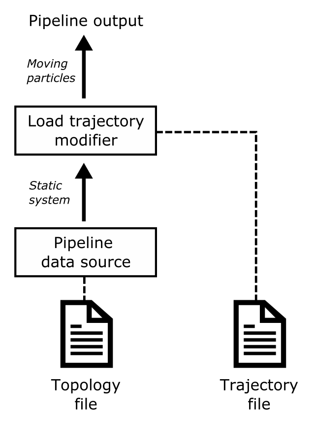 Some molecular dynamics codes work with separate topology and trajectory files. The topology file typically serves as starting point of the MD simulation and contains the initial atomic positions and the definitions of static structures like the atom types, bonds, etc., which do not change throughout the simulation. The trajectories of the particles computed by the MD code are then written to an output file, which stores just the time-dependent coordinates and sometimes other varying information such as the atomic energies.