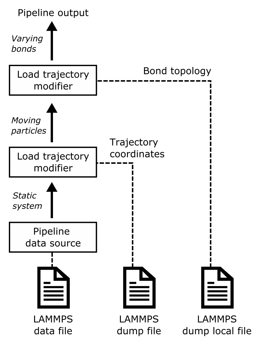 LAMMPS is a simulation code that employs this topology-trajectory file philosophy. LAMMPS uses the data file format for input files, which define the atom types and bonds in the simulation, whereas the dump file format serves as output format storing the computed atom trajectories and other time-varying information.