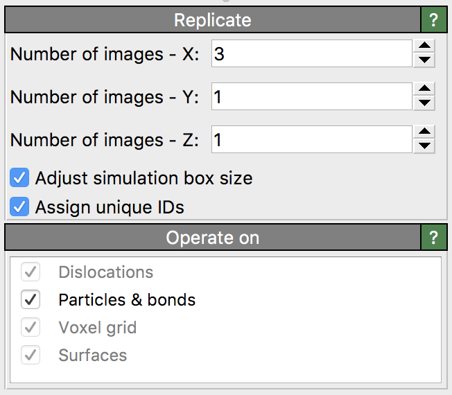 The Operate on list in the lower panel lets you select the types of data elements that should be replicated by the modifier. By default, the modifier extends the simulation cell appropriately to encompass all generated images of the system. If not desired, you can turn off the option Adjust simulation box size to keep the original simulation cell geometry. You should be aware, however, that this produces an inconsistent state, where the periodicity length no longer fits to the explicitly replicated contents of the simulation cell.